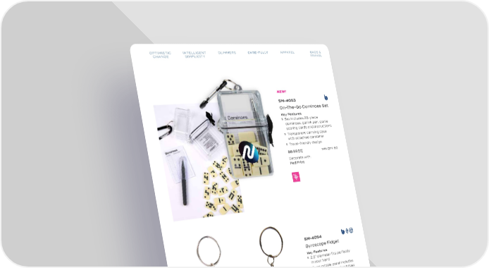 OPTIMISTIC INTELLIGENT GLIMMERS OPTIMISTIC INTELLIGENT GLIMMERS APPAAPRPEALREL BAGBSA & G S & CHANGE SIMPLICITY CHANGE SIMPLICITY TRATVREALVEL NEW! SM-4053 On-The-Go Dominoes Set Key Features Set includes 28-piece dominoes, gel ink pen, game scoring cards and instructions Transparent carrying case with attached carabiner Travel-friendly design $8.98 [C] MIN QTY: 50 Decorate with: Pad Print SM-4054 Gyroscope Fidget Key Features 2.2” diameter fits perfectly in your hand Front middle panel includes 5 buttons for another fidget option, three of them click and the other two are silent Attached keyring perfect for travel and on the go convenience Made from recycled ABS $2.48 [C] MIN QTY: 200 Decorate with: Digital Inkjet 74 TRENDS: 2025