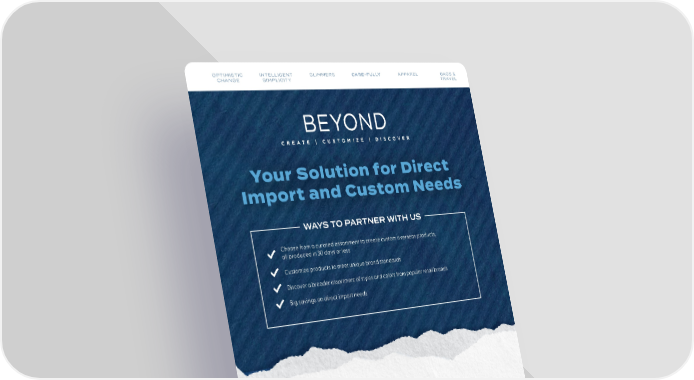 OPTIMISTIC INTELLIGENT GLIMMERS OPTIMISTIC INTELLIGENT GLIMMERS APPAAPRPEALREL BAGBSA & G S & CHANGE SIMPLICITY CHANGE SIMPLICITY TRATVREALVEL Your Solution for Direct Import and Custom Needs WAYS TO PARTNER WITH US Choose from a curated assortment to create custom overseas products, all produced in 30 days or less Customize products to meet unique brand standards Discover a broader assortment of styles and colors from popular retail brands Big savings on direct import needs WHY BEYOND? Competitive Pricing Fast Production and Shipping Quality Service Curated product Aggressive pricing BEYOND stands Dedicated team assortment with structure with competitive behind high quality of experts in both guaranteed production and expedited shipping standards and strict North America time of less than options available to meet compliance requirements. and overseas. 30 days. your in-hands date. 96 TRENDS: 2025