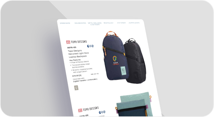DRINKWARE HOUSEWARES GIFTS, WELLNESS TECHNOLOGY STATIONERY JOURNALBOOKS DRINKWARE HOUSEWARES GIFTS, WELLNESS TECHNOLOGY STATIONERY JOURNALBOOKS & OUTDOOR & OUTDOOR 8676-03 Topo Designs Recycled Light Pack Laptop Backpack Key Features Internal laptop sleeve Two expandable water bottle pockets Exterior zippered pocket with organization $79.00 [D] MIN QTY: 8 Decorate with: Digital Transfer | Embroidery 8676-08 Topo Designs Accessory Travel Pouch Key Features Fully-lined pack cloth interior for easy cleaning Paracord hook loop and zipper pull Heavy-duty YKK zipper Webbing pull tabs Dimensions: 9.5”w x 7.5”h $19.00 [D] MIN QTY: 25 Decorate with: Digital Transfer | Embroidery TRENDS: 2025 41