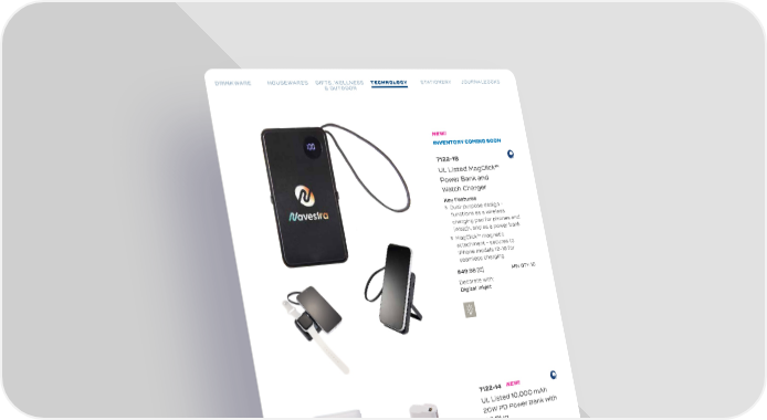 DRINKWARE HOUSEWARES GIFTS, WELLNESS TECHNOLOGY STATIONERY JOURNALBOOKS DRINKWARE HOUSEWARES GIFTS, WELLNESS TECHNOLOGY STATIONERY JOURNALBOOKS & OUTDOOR & OUTDOOR NEW! INVENTORY COMING SOON 7122-18 UL Listed MagClick™ Power Bank and Watch Charger Key Features Dual-purpose design - functions as a wireless charging pad for phones and iWatch, and as a power bank MagClick™ magnetic attachment - secures to iPhone models 12-16 for seamless charging $49.98 [C] MIN QTY: 10 Decorate with: Digital Inkjet 7122-14 NEW! UL Listed 10,000 mAh 20W PD Power Bank with AC Plug Key Features 10,000 mAh/36Wh rechargeable lithium polymer battery, AC adapter with Type-C output Power Delivery (PD) technology at 20W lightning-fast charging $49.98 [C] MIN QTY: 10 Decorate with: Digital Inkjet TRENDS: 2025 79