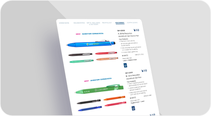 DRINKWARE HOUSEWARES GIFTS, WELLNESS TECHNOLOGY STATIONERY JOURNALBOOKS DRINKWARE HOUSEWARES GIFTS, WELLNESS TECHNOLOGY STATIONERY JOURNALBOOKS & OUTDOOR & OUTDOOR SM-5308 NEW! INVENTORY COMING SOON A. Brite Recycled Aluminum Gel Stylus Pen Key Features Diamond-textured tip enhances grip and adds a stylish touch 94% recycled aluminum barrel - UV-coated for durability 0.5mm black gel ink tip $1.99 [C] MIN QTY: 250 Decorate with: Laser | Digital Inkjet SM-5306 NEW! INVENTORY COMING SOON B. Vera Recycled Aluminum Gel Pen Key Features Color-matching accents add a cohesive, stylish touch 1.0mm writing tip delivers smooth black ink Recycled aluminum barrel with soft touch coating $1.99 [C] MIN QTY: 250 Decorate with: Digital Inkjet | Laser SM-5303 NEW! INVENTORY COMING SOON Shoreside Gel Pen Key Features Made from 15% shell and 85% recycled polypropylene (RPP) 300 meters of writing length for long-lasting performance and everyday use Click-action design $0.79 [C] MIN QTY: 250 Decorate with: Digital Inkjet TRENDS: 2025 85