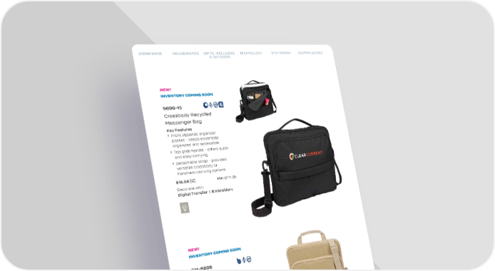 DRINKWARE HOUSEWARES GIFTS, WELLNESS TECHNOLOGY STATIONERY JOURNALBOOKS DRINKWARE HOUSEWARES GIFTS, WELLNESS TECHNOLOGY STATIONERY JOURNALBOOKS & OUTDOOR & OUTDOOR NEW! INVENTORY COMING SOON 9898-13 Crossbody Recycled Messenger Bag Key Features Front zippered organizer pocket - keeps essentials organized and accessible Top grab handle - offers quick and easy carrying Detachable strap - provides versatile crossbody or handheld carrying options $16.98 [C] MIN QTY: 25 Decorate with: Digital Transfer | Embroidery NEW! INVENTORY COMING SOON SM-8205 Vertical Recycled Messenger Bag Key Features Padded laptop sleeve - provides secure protection for your device Front zippered organizational pocket - offers quick access to accessories and essentials Top grab handle - convenient for on-the-go carrying $14.98 [C] MIN QTY: 20 Decorate with: Silkscreen | Digital Transfer Embroidery TRENDS: 2025 45