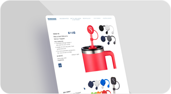 DRINKWARE HOUSEWARES GIFTS, WELLNESS TECHNOLOGY STATIONERY JOURNALBOOKS DRINKWARE HOUSEWARES GIFTS, WELLNESS TECHNOLOGY STATIONERY JOURNALBOOKS & OUTDOOR & OUTDOOR 1602-15 Recycled Silicone Straw Topper Key Features Tethered design keeps it secured to your straw Made of 30% recycled, food grade silicone Fun and practical accessory for your straw tumbler $1.98 [C] MIN QTY: 250 Decorate with: Pad Print SM-6967 Silicone Straw Topper Key Features Tethered design keeps it secured to your straw Made of food grade silicone material Fun and practical accessory for your straw tumbler Designed for straws up to 10mm diameter (0.4inch) $1.15 [C] MIN QTY: 250 Decorate with: Silkscreen TRENDS: 2025 61