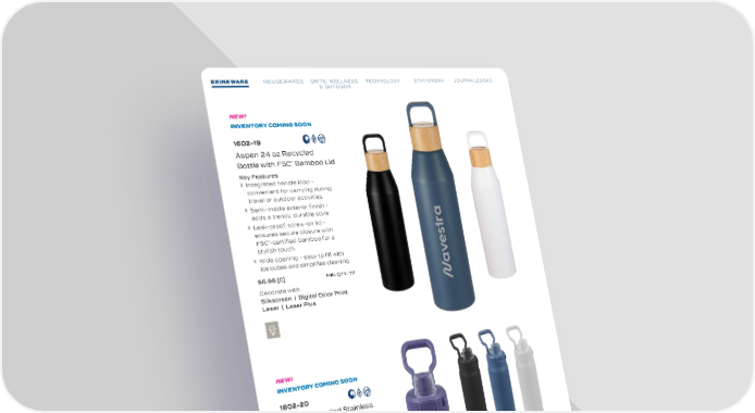 DRINKWARE HOUSEWARES GIFTS, WELLNESS TECHNOLOGY STATIONERY JOURNALBOOKS DRINKWARE HOUSEWARES GIFTS, WELLNESS TECHNOLOGY STATIONERY JOURNALBOOKS & OUTDOOR & OUTDOOR NEW! INVENTORY COMING SOON 1602-19 Aspen 24 oz Recycled ® Bottle with FSC Bamboo Lid Key Features Integrated handle loop - convenient for carrying during travel or outdoor activities Semi-matte exterior finish - adds a trendy, durable style Leak-proof, screw-on lid - ensures secure closure with FSC®-certified bamboo for a stylish touch Wide opening - easy to fill with ice cubes and simplifies cleaning $6.98 [C] MIN QTY: 72 Decorate with: Silkscreen | Digital Color Print Laser | Laser Plus NEW! INVENTORY COMING SOON 1602-20 Canyon Recycled Stainless Steel Bottle 30 oz Key Features Spill-resistant lid - screw-on design with a button-locked flip-top spout for secure sipping Lightweight single-wall construction - compact and easy to transport Fits standard cup holders - compatible with most car and bike holders $9.98 [C] MIN QTY: 48 Decorate with: Silkscreen | Digital Color Print Laser | Laser Plus TRENDS: 2025 59
