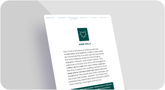 DRINDKRWINAKRWEARE HOUHOSEUWSAERWEASRESGIFTGSIF, WTSE,LL WNEELLSNS ESS TECTHENCOHLNOOGLYOGY STATSIOTANTEIORNYERY JOUJRONUARLNABOLOBKOSOKS & OUTDOOR & OUTDOOR Care-Fully is all about prioritizing wellness, mindfulness, and balance in today’s busy world. As consumers focus on self-care and well-being, this trend features products that enhance relaxation, recovery, and overall comfort. This collection embraces this ethos with thoughtfully crafted items made from eco-friendly materials, blending function with soothing aesthetics. From sleep aids to wellness essentials, each product is designed to help people slow down, recharge, and live more intentionally. Discover how “Care-Fully” products help customers make wellness a priority while creating meaningful connections. U.S. consumers now consider wellness a top or important priority in their everyday lives, and Millennial and Gen Z consumers are spending more on health and wellness than older consumers. % 39 of consumers want to spend more time outdoors. PRODUCTS PICTURED TO LEFT: 1415-01 Wellable™ Bamboo Diffuser 1415-03 Wellable™ White Noise Sunrise Alarm Clock 1415-08 Wellable™ Noise Reducing Ear Plugs TRENDS: 2025 11