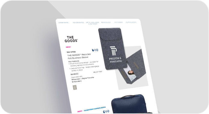 DRINKWARE HOUSEWARES GIFTS, WELLNESS TECHNOLOGY STATIONERY JOURNALBOOKS DRINKWARE HOUSEWARES GIFTS, WELLNESS TECHNOLOGY STATIONERY JOURNALBOOKS & OUTDOOR & OUTDOOR NEW! SM-5758 THE GOODSTM Recycled Felt Business Sleeve Key Features Multi-functional design - suitable for holding laptops or documents Secure front flap - keeps belongings safely in place $5.98 [C] MIN QTY: 100 Decorate with: Silkscreen | Digital Transfer Embroidery NEW! INVENTORY COMING SOON 9898-14 Diamond Ripstop Recycled 15” Laptop Sleeve Key Features Padded laptop sleeve - designed to protect laptops up to 15” during travel Front zippered pocket - includes organization pockets for accessories and small items Top grab handle - convenient for quick, easy carrying $13.98 [C] MIN QTY: 30 Decorate with: Digital Transfer | Embroidery TRENDS: 2025 47