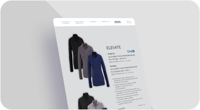 OPTIMISTIC INTELLIGENT GLIMMERS OPTIMISTIC INTELLIGENT GLIMMERS APPAAPRPEALREL BAGBSA & G S & CHANGE SIMPLICITY CHANGE SIMPLICITY TRATVREALVEL ELEVATE TM98175 IZU EVERYTHING PERFORMANCE Eco Full Zip - Women’s SIZE OPTIONS: XS, S, M, L, XL, 2XL TM18174 IZU EVERYTHING PERFORMANCE Eco Quarter Zip - Men’s SIZE OPTIONS: S, M, L, XL, 2XL, 3XL Showcases fabric innovation with stretch and antimicrobial elements for durability and comfort Made from 85% recycled polyester certified by GRS, 10% lyocell, and 5% elastane Features antimicrobial properties, UV protection, odor control, snag resistance, and moisture-wicking capabilities Women’s style features full zip and two lower zipper pockets Men’s style features quarter zip and one zippered chest pocket $45.33 [C] MIN QTY: 12 Decorate with: Apparel Digital Transfer Apparel Embroidery | Apparel HXD 22 TRENDS: 2025