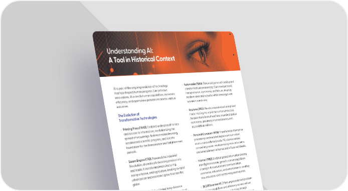Understanding AI: A Tool in Historical Context AI is part of the ongoing evolution of technology • Automobile (1886): Enhanced personal mobility and that has shaped human progress. Like previous transformed urban planning. Cars revolutionized innovations, AI extends human capabilities, increases transportation, commerce, and leisure, shaping efficiency, and opens new possibilities across various modern cities and suburbs while creating a vast industries. automotive industry. The Evolution of • Airplane (1903): Revolutionized travel and global Transformative Technologies trade, making the world more interconnected. Aviation transformed warfare, expedited global • Printing Press (1440): Enabled widespread literacy commerce, and made international tourism and access to information, revolutionizing the accessible to millions. spread of knowledge. It democratized learning, accelerated scientific progress, and laid the • Personal Computer (1974): Transformed information foundation for the Renaissance and Enlightenment processing and enabled digital communication periods. on an unprecedented scale. PCs democratized computing power, revolutionizing work, education, • Steam Engine (1712): Powered the Industrial and entertainment in homes and offices worldwide. Revolution, dramatically boosting productivity and trade. It transformed manufacturing, • Internet (1983): Enabled global information sharing transportation, and agriculture, leading to rapid and digital economy growth, connecting billions urbanization and economic growth across the of people. It revolutionized communication, globe. commerce, education, and entertainment, creating new industries and transforming existing ones. • Telegraph (1797): Facilitated long-distance communication, shrinking the world in terms of • AI (2010s-present): Offers unprecedented problem- information exchange. It revolutionized business, solving capabilities and efficiency across various journalism, and diplomacy by enabling near-instant sectors. AI is transforming industries through messaging across vast distances. automation, predictive analytics, and personalized experiences, with potential to revolutionize • Telephone (1876): Allowed real-time voice healthcare, transportation, and scientific research. communication, fundamentally changing personal and business interactions. It connected people across great distances, fostering closer relationships and more efficient business operations. • Light Bulb (1879): Extended productive hours and significantly improved quality of life. Electrification transformed homes, workplaces, and cities, powering countless innovations and reshaping society. © Copyright 2025 Continuum | discovercontinuum.com