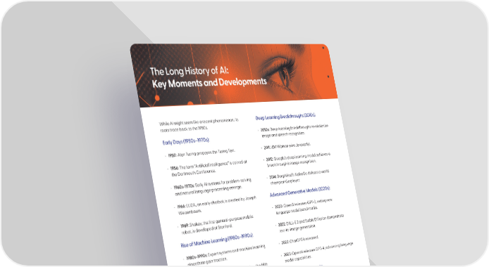 The Long History of AI: Key Moments and Developments While AI might seem like a recent phenomenon, its Deep Learning Breakthroughs (2010s): roots trace back to the 1950s. • 2010s: Deep learning breakthroughs revolutionize Early Days (1950s–1970s): image and speech recognition. • 1950: Alan Turing proposes the Turing Test. • 2011: IBM Watson wins Jeopardy!. • 1956: The term “Artificial Intelligence” is coined at • 2012: Google’s deep learning model achieves a the Dartmouth Conference. breakthrough in image recognition. • 1960s-1970s: Early AI systems for problem-solving • 2014: DeepMind’s AlphaGo defeats a world and natural language processing emerge. champion Go player. • 1966: ELIZA, an early chatbot, is created by Joseph Advanced Generative Models (2020s): Weizenbaum. • 2020: OpenAI releases GPT-3, setting new • 1969: Shakey, the first general-purpose mobile language model benchmarks. robot, is developed at Stanford. • 2022: DALL-E 2 and Stable Diffusion demonstrate Rise of Machine Learning (1980s–1990s): text-to-image generation. • 1980s-1990s: Expert systems and machine learning • 2022: ChatGPT is released. algorithms gain traction. • 2023: OpenAI releases GPT-4, advancing language • 1981: The Japanese government launches the Fifth model capabilities. Generation Computer Project. Ongoing Developments: • 1991: IBM’s Deep Blue defeats chess champion Garry Kasparov. • Advancements in reinforcement learning and robotics. AI Enters Consumer Markets (2000s): • Progress in explainable AI and ethical AI • 2000s: AI is integrated into consumer products. frameworks. • 2002: iRobot Roomba is launched. • Growing focus on AI alignment and safety. • 2005: DARPA holds its first Grand Challenge for • Increasing integration of AI in scientific research, autonomous vehicles. healthcare, and climate modeling. © Copyright 2025 Continuum | discovercontinuum.com