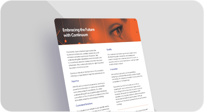 Embracing the Future with Continuum AI presents unprecedented opportunities for Quality businesses to innovate, optimize operations, and enhance customer experiences. However, fully Our team ensures that AI-generated content meets understanding the capabilities and limitations of AI the highest quality standards, maintaining your is crucial for businesses looking to harness its power brand’s integrity. We understand that AI is a tool – a effectively. This is where choosing the right AI partner powerful one, but a tool nonetheless – and we wield becomes critical for success. it with skill and wisdom. Continuum stands at the forefront of this revolution, Innovation offering a unique blend of expertise and innovation. We continuously evolve our AI capabilities, Expertise keeping you ahead in the dynamic world of digital marketing. This ongoing innovation allows you to stay With 40 years of industry experience, we bring a competitive in the digital age. powerful combination of traditional knowledge and cutting-edge AI capabilities. Our deep By partnering with Continuum, you’re not just understanding of AI as a sophisticated tool allows adopting AI—you’re embracing a future where us to enhance the critical human elements that drive technology and human creativity work in perfect innovation, empathy, and strategic thinking. harmony. We guide the implementation of AI solutions, ensuring they enhance rather than replace Customized Solutions the human elements of your business. With our expertise, AI becomes a powerful ally in your business Our Creative Suite adapts to your specific needs, strategy. from AI-enhanced production to comprehensive creative development. We ensure that AI solutions align with your business goals while maintaining ethical standards and human oversight. Remember, the key to success lies in partnering with Efficiency experts who can help you navigate the AI landscape thoughtfully and address concerns effectively. We We help you overcome resource limitations and ensure that you can leverage AI to transform your optimize your marketing budget through intelligent business while maintaining control and aligning with automation and streamlined workflows. Our approach dramatically improves efficiency, decision- your values and goals. making, and competitive advantage. Ready to supercharge your marketing with AI? Contact us! Continuum has the AI and human expertise to take your marketing to the next level. © Copyright 2025 Continuum | discovercontinuum.com