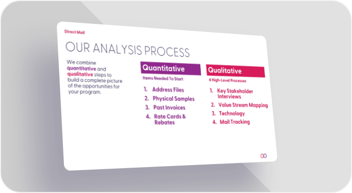 Direct Mail OUR ANALYSIS PROCESS We combine Quantitative Qualitative quantitativeand qualitativesteps to Items Needed To Start 4 High-Level Processes build a complete picture of the opportunities for 1. Address Files 1. Key Stakeholder your program. 2. Physical Samples Interviews 3. Past Invoices 2. Value Stream Mapping 4. Rate Cards & 3. Technology Rebates 4. Mail Tracking