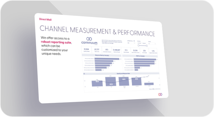 Direct Mail CHANNEL MEASUREMENT & PERFORMANCE We offer access to a robust reporting suite, which can be customized to your unique needs.