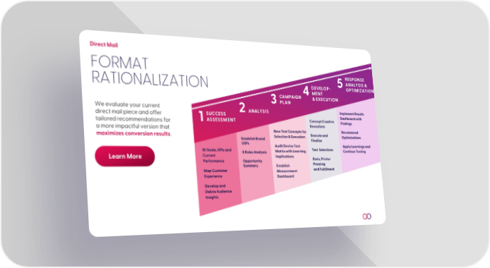 Direct Mail FORMAT RESPONSE DEVELOP- 5ANALYSIS & RATIONALIZATION 4MENT OPTIMIZATION 3CAMPAIGN &EXECUTION PLAN We evaluate your current 2ANALYSIS Implement Results direct mail piece and offer SUCCESS Dashboard with tailored recommendations for 1 ASSESSMENT Concept Creative Findings a more impactful version that Executions maximizes conversion results. New Test Concepts for Execute and Recommend Establish Brand Selection & Execution Finalize Optimizations USPs Audit Devise Test Apply Learnings and ID Goals, KPIs and 8 Rules Analysis Matrix with Learning Test Selections Continue Testing Learn More Current Implications Data, Printer Performance Opportunity Proofing Summary Establish and Fulfillment Map Customer Measurement Experience Dashboard Develop and Define Audience Insights