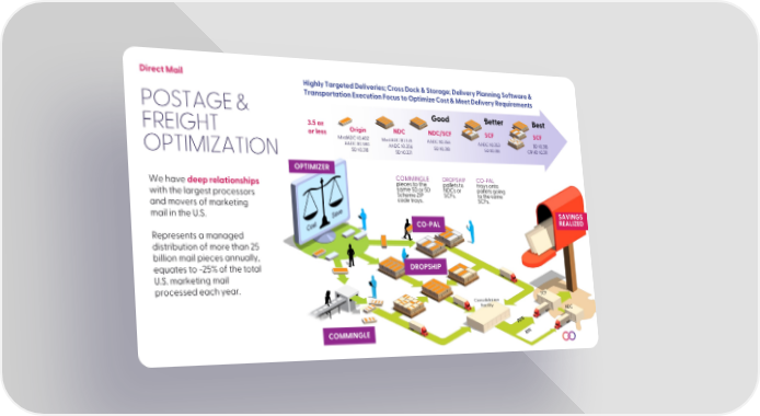 Direct Mail Highly Targeted Deliveries; Cross Dock & Storage; Delivery Planning Software & POSTAGE & Transportation Execution Focus to Optimize Cost & Meet Delivery Requirements Good Better Best 3.5 oz Origin NDC NDC/SCF SCF SCF FREIGHT or less MxdADC$0.402 MxdADC$0.378 AADC$0.356 AADC$0.380 AADC$0.353 5D$0.318 AADC$0.356 5D$0.318 5D$0.318 CR HD$0.311 OPTIMIZATION 5D$0.318 5D$0.321 OPTIMIZER COMMINGLE DROPSHIP CO-PAL We have deep relationships pieces to the pallets to trays onto same 5D or 5D NDCs or pallets going with the largest processors Scheme ZIP SCFs. to the same and movers of marketing code trays. SCFs. mail in the U.S. SAVINGS CO-PAL REALIZED Represents a managed distribution of more than 25 billion mail pieces annually, equates to ~25% of the total DROPSHIP U.S. marketing mail processed each year. SCF Consolidation Facility NDC COMMINGLE