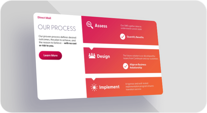 Direct Mail Assess Our SMEs gather data to OUR PROCESS understand current state Quantify Benefits Our proven process defines desired outcomes, the plan to achieve, and the reason to believe —with no cost or risk to you. Learn More Design The future solution is co-developed by teams from Continuum and our customers Align on Business Relationship A rigorous and well-tested Implement implementation program ensures transition success 11
