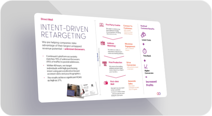 Direct Mail First Party Cookie Connect To Realized Customers Customer Benefits We apply a website tag with content that collects & models tailored to their INTENT-DRIVEN browsing data, including online interests abandoned carts. RETARGETING Lower Costs We are helping companies take Address Maximize advantage of their largest untapped Matching* Engagement with “in market” revenue potential —unknown browsers. ery The data we collect is buyers v i matched to real person’s el name and mailing address. d o Time Back eek t a • Continuum’s platform accurately t e Wa matches 70% of unknown browsers n d O m o (95% of traffic) to postal addresses. r Print Production Drive e f m Conversion • Within 48 hours, we target i T We receive the mailing with perfectly timed individuals with high purchasing address and print them campaigns intent using personalization based (same day) at our digital Higher on intent data and psychographics. print facilities. Conversion • The results achieve significant ROAS = as high as 37%. First-class Generate Mail Sales Increased then retain Profits We mail it so your soon- customers to meet to-be-customer your LTV goals receives it within 5 days … and you get the most bang for your buck.