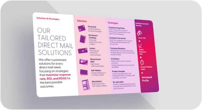 Solutions & Strategies Solutions Strategies Realized Customer Benefits Postcards Customer Acquisition Simple & effective GOAL Attract new customers. for quick messages. Strategy Use targeted offers and OUR clear brand messaging. Brochures/ Customer Conversion Lower CAC Catalogs Goal Turn prospects into customers. TAILORED Showcase Strategy Highlight benefits with products/services strong CTAs. in detail. DIRECT MAIL Letters Customer Retention Higher Personalized Goal Maintain existing relationships. Response and formal Strategy Regular communication and Rate SOLUTIONS communication. loyalty rewards. We offer customized Dimensional Invitations Mail Goal Invite to events or special solutions for every High impact, occasions. creative packages. Strategy Emphasize exclusivity and Greater Lifetime direct mail need, easy RSVP. focusing on strategies Self-Mailers Product Samples Value that maximize response Engaging designs, no Goal Encourage product trial. = envelope needed. Strategy Provide free samples with rate, ROI, and ROASfor purchase instructions. Increased the best possible Newsletters Re-activation Profits outcomes. Build relationships Goal Re-engage lapsed customers. with regular updates. Strategy Personalized offers to win back customers.