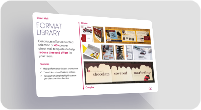 Direct Mail Simple FORMAT LIBRARY Continuum offers a curated selection of 40+ proven direct mail templates to help reduce time and effortfor your team. Features High performance designs & templates Tiered die-cut and finishing options Ranges from simple to highly custom per client creative direction Complex
