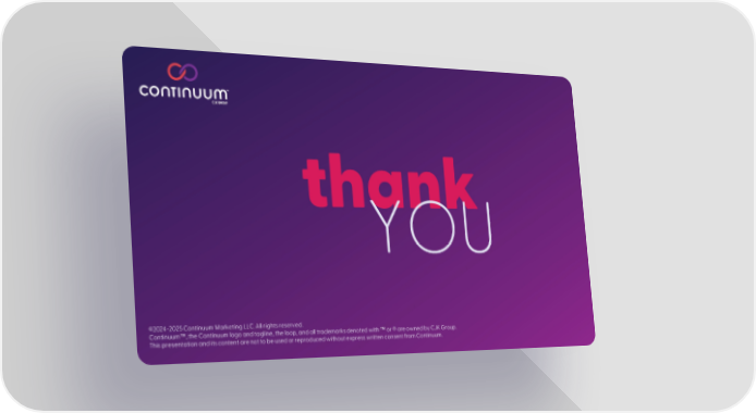 thank YOU ©2024-2025 Continuum Marketing LLC. All rights reserved. Continuum , the Continuum logoand tagline, the loop, and all trademarks denoted with or ® are owned by CJK Group. This presentation and its content arenot to be used or reproduced without express written consentfrom Continuum.