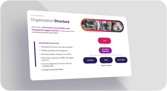 EDUCATION BRIDGE Organization Structure We provide a structured, accountable, and transparent support system so every project stays on track and exceeds expectations. RESPONSIBILITIES INCLUDE • Centralized overview across all service lines • Timeline and milestone management • Real-time problem solving and escalation • Performance reporting via QBRs and regular check-ins • Proactive alignment of services with your evolving needs • Develop strong relationships YOU ACCOUNT TEAM LEAD CONTENT PRINT FULFILLMENT Resource Teams
