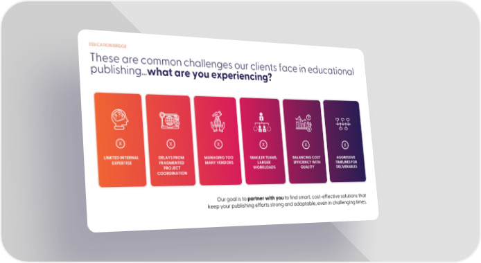 These are common challenges our clients face in educational publishing... what are you experiencing? EDUCATION BRIDGE Our goal is to partner with you to find smart, cost-effective solutions that keep your publishing efforts strong and adaptable, even in challenging times. LIMITED INTERNAL EXPERTISE DELAYS FROM FRAGMENTED PROJECT COORDINATION MANAGING TOO MANY VENDORS BALANCING COST EFFICIENCY WITH QUALITY SMALLER TEAMS, LARGER WORKLOADS X X X X X AGGRESSIVE TIMELINES FOR DELIVERABLES X