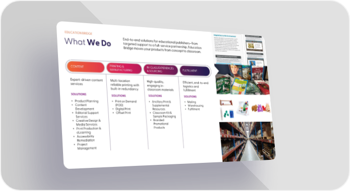 EDUCATION BRIDGE What We Do End-to-end solutions for educational publishers—from targeted support to a full-service partnership, Education Bridge moves your products from concept to classroom. CONTENT PRINTING & MANUFACTURING IN-CLASS EXPERIENCES & SOURCING FULFILLMENT Expert-driven content services Multi-location reliable printing with built-in redundancy High-quality, engaging in- classroom materials Efficient, end-to-end logistics and fulfillment SOLUTIONS SOLUTIONS SOLUTIONS • Product Planning • Content Development • Editorial Support Services • Creative Design & Media Services • Print Production & eLearning • Accessibility Remediation • Project Management • Print on Demand (POD) • Digital Print • Offset Print • Mailing • Warehousing • Fulfillment SOLUTIONS • Ancillary Print & Supplemental Resources • Classroom Kit & Sample Packaging • Branded Promotional Products