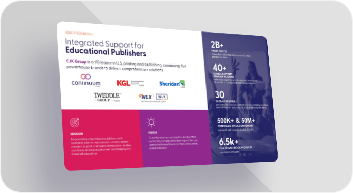 EDUCATION BRIDGE Integrated Support for Educational Publishers CJK Group is a $1B leader in U.S. printing and publishing, combining five powerhouse brands to deliver comprehensive solutions MISSION Empowering educational publishers with seamless, end-to-end solutions—from content creation to print and digital distribution—so they can focus on inspiring learners and shaping the future of education VISION To be the most trusted partner in education publishing, turning ideas into impact through unmatched expertise in content, production, and distribution 40+ with deep expertise producing custom designs of ancillary, corrugated and manipulative kits GLOBAL PARTNERS IN MANUFACTURING 30 providing full-service content creation, printing, binding, and fulfillment — specializing in educational publishing GLOBAL FACILITIES 2B+ annually by Sheridan across our U.S. book printing facilities PAGES PRINTED 500K+ & 50M+ CURRICULUM KITS & COMPONENTS created & delivered in the last 3 years 6.5k+ developed annually FULL-SERVICE BOOK PRODUCTS