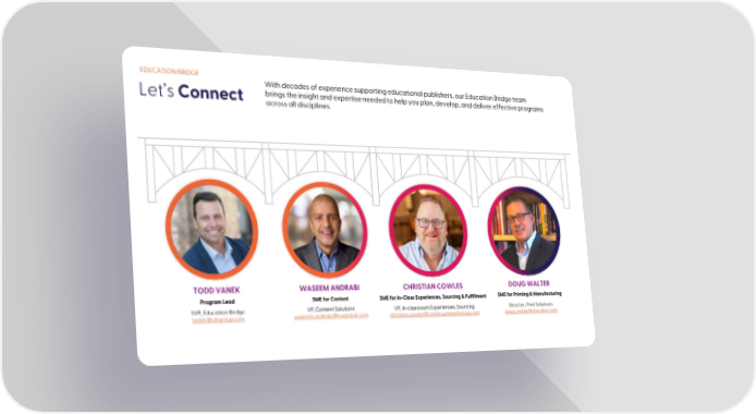 EDUCATION BRIDGE Let’s Connect With decades of experience supporting educational publishers, our Education Bridge team brings the insight and expertise needed to help you plan, develop, and deliver effective programs across all disciplines. CHRISTIAN COWLES SME for In-Class Experiences, Sourcing & Fulfillment VP, In-classroom Experiences, Sourcing christian.cowles@continuummarketing.com DOUG WALTER SME for Printing & Manufacturing Director, Print Solutions doug.walter@sheridan.com WASEEM ANDRABI SME for Content VP, Content Solutions waseem.andrabi@kwglobal.com TODD VANEK Program Lead SVP, Education Bridge toddv@cjkgroup.com