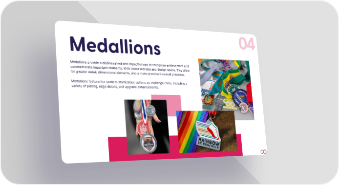 Medallions Medallions provide a distinguished and impactful way to recognize achievement and commemorate important moments. With increased size and design space, they allow for greater detail, dimensional elements, and a more prominent overall presence. Medallions feature the same customization options as challenge coins, including a variety of plating, edge details, and upgrade enhancements. 04