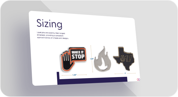 Sizing Lapel pins are sized by their longest dimension, providing a consistent approach across all shapes and designs.