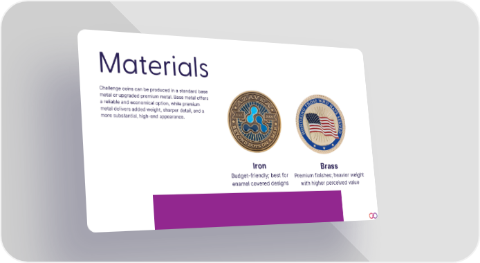Materials Challenge coins can be produced in a standard base metal or upgraded premium metal. Base metal offers a reliable and economical option, while premium metal delivers added weight, sharper detail, and a more substantial, high-end appearance. Iron Budget-friendly; best for enamel covered designs Brass Premium finishes; heavier weight with higher perceived value