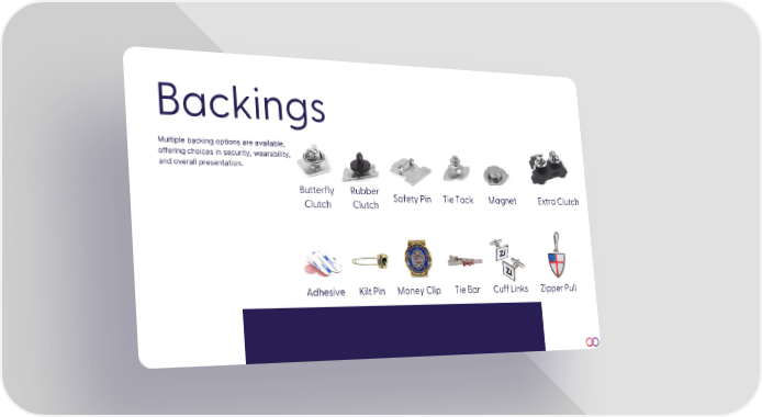 Adhesive Kilt Pin Money Clip Tie Bar Cuff Links Zipper Pull Backings Multiple backing options are available, offering choices in security, wearability, and overall presentation. Butterfly Clutch Rubber Clutch Safety Pin Tie Tack Magnet Extra Clutch