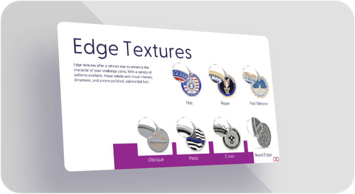 Edge Textures Edge textures offer a refined way to enhance the character of your challenge coins. With a variety of patterns available, these details add visual interest, dimension, and a more polished, substantial feel. Flat Rope Flat Weave Reed Edge Cross Petal Oblique