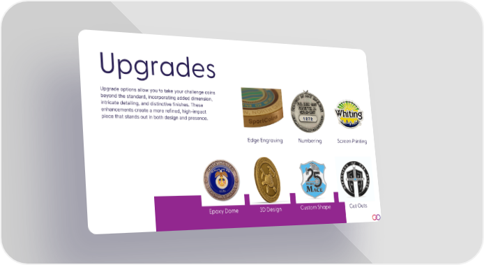 Upgrades Upgrade options allow you to take your challenge coins beyond the standard, incorporating added dimension, intricate detailing, and distinctive finishes. These enhancements create a more refined, high-impact piece that stands out in both design and presence. Edge Engraving Numbering Screen Printing Cut Outs Custom Shape 3D Design Epoxy Dome