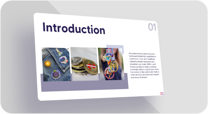 01 This Emblematics Guide showcases Continuum Marketing’s capabilities in custom pins, coins, and medallions; crafted to elevate recognition and strengthen your brand. Within, you’ll find an overview of styles, materials, and design options to guide your vision. Every piece is fully custom and made to order; pricing is provided upon request and review of artwork. Introduction