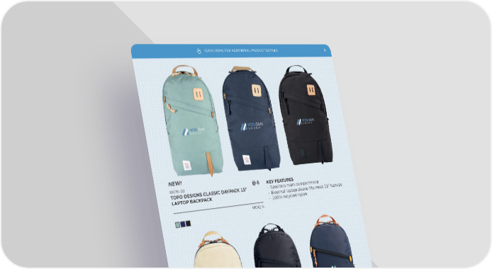 CLICK ITEMS FOR ADDITIONAL PRODUCT DETAILS 5 NEW! ‘ KEY FEATURES TOPO DESIGNS CLASSIC DAYPACK ›œ” • Spacious main compartment LAPTOP BACKPACK • External laptop sleeve fits most ”” laptops • % recycled nylon MOQ: NEW! — KEY FEATURES TOPO DESIGNS LIGHT PACK ›œ” • % recycled nylon LAPTOP BACKPACK • Padded base and sides • Internal laptop sleeve MOQ: