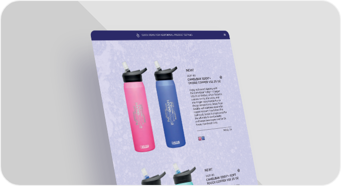 CLICK ITEMS FOR ADDITIONAL PRODUCT DETAILS 33 NEW! ¨©ª«¬®ª ® CAMELBAK EDDY + OMBRE COPPER VSS ¢œ OZ Enjoy spill-proof sipping with ® ® the CamelBak Eddy + Copper VSS 25 oz Ombre, which features a screw-on lid, bite valve, and one-finger carry handle for on the go convenience. Made from double-wall stainless steel with copper vacuum insulation, this trail-ready bottle is engineered for the ultimate in conductivity and keeps beverages cold for 24 hours. Handwash only. MOQ: ª° NEW! ¨©ª«¬®² ® CAMELBAK EDDY + SOFT TOUCH COPPER VSS ¢œ OZ Enjoy spill-proof sipping with the ® ® CamelBak Eddy + Soft Touch 25 oz VSS, which features a screw-on lid, bite valve, and one-finger carry handle, this item will make your adventures last longer. Perfect for your trip to the gym or the trail, the newly designed cap provides enhanced flow rates and a handle designed for secure carry no matter what journey awaits you. Keeps beverages cold for 24 hours. Handwash only. MOQ: ª°