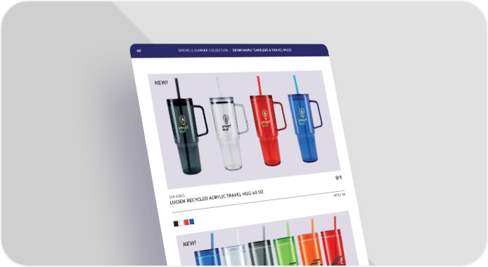 | SPRING & SUMMER COLLECTION DRINKWARE: TUMBLERS & TRAVEL MUGS 40 NEW! SM £— LUCIEN RECYCLED ACRYLIC TRAVEL MUG £¡ OZ MOQ: £ NEW! SM ‘ CHROMA RECYCLED ACRYLIC SKINNY TUMBLER ›¦ OZ MOQ: £