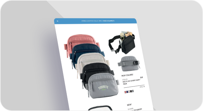 14 SPRING & SUMMER COLLECTION | BAGS & BLANKETS NEW COLORS! —” RECYCLED SPORT FANNY PACK MOQ: ¤ NEW! SM ”££ CLEAR CROSSBODY SPORT PACK The Clear Crossbody Sport Pack is made from see-through PVC material for easy inspection of its contents and designed to comply with most stadium and festival safety regulations. A zippered main compartment is the perfect size to securely hold all your daily essentials. MOQ: ”