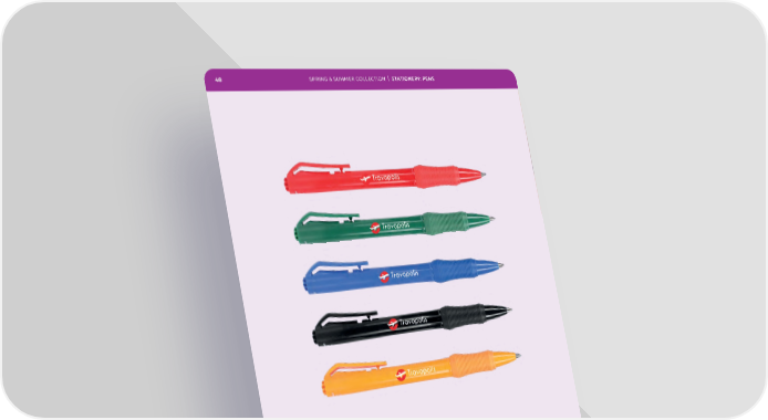 | 48 SPRING & SUMMER COLLECTION STATIONERY: PENS 48 NEW! SM ”‘¤ SLIM RECYCLED ABS GEL PEN The Slim Recycled ABS Gel Pen features a 100% RABS barrel and grip. Smooth blue gel ink with 150 meters of writing length. Click action design and 0.7mm tip. Through a ® partnership with 1% For The Planet, one percent of sales of all EcoSmart products are donated to environmental nonprofits. MOQ: ‘”