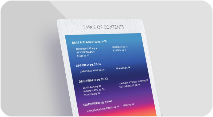 TABLE OF CONTENTS BAGS & BLANKETS: pg. 4–19 TOPO DESIGNS: pg. 4 CAMELBAK: pg. 12 WOLVERINE: pg. 6 WENGER: pg. 13 FEED: pg. 10 APPAREL: pg. 20–31 GREATNESS WINS: pg. 20 TRIMARK: pg. 24 DRINKWARE: pg. 32–43 CAMELBAK: pg. 32 TUMBLERS & TRAVEL MUGS: pg. 38 HYDRO FLASK: pg. 34 WATER BOTTLES: pg. 42 STANLEY: pg. 36 STATIONERY: pg. 44–49 NOTEBOOKS & JOURNALS: pg. 44 PENS: pg. 48 TECH: pg. 50–55 WIRELESS CHARGING PADS: pg. 50 POWER BANKS: pg. 52 PRINTERS: pg. 51 SPEAKERS & EARBUDS: pg. 54 GIFTS: pg. 56–59 SUNGLASSES: pg. 56 PERSONAL CARE: pg. 58 KEYCHAINS & LANYARDS: pg. 57 FLASHLIGHTS: pg. 59 GIVEE: pg. 60–63