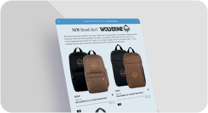 6 SPRING & SUMMER COLLECTION | BAGS: WOLVERINE NEW Brand Alert! Wolverine backpacks, duffles, tool bags, and coolers are the perfect combination of super-durable materials and hard-working designs. Available in a variety of styles that are built to last, each of their bags and accessories are made to maximize storage, comfort, and functionality — while maintaining the same values that generations have trusted for over 140 years. NEW! NEW! — — WOLVERINE ¢£L CLASSIC BACKPACK WOLVERINE Ÿ¡L TRANSIT BACKPACK MOQ: ‘ MOQ: ‘ NEW! — WOLVERINE ¢¢ INCH CENTER ZIP DUFFEL MOQ: ‘