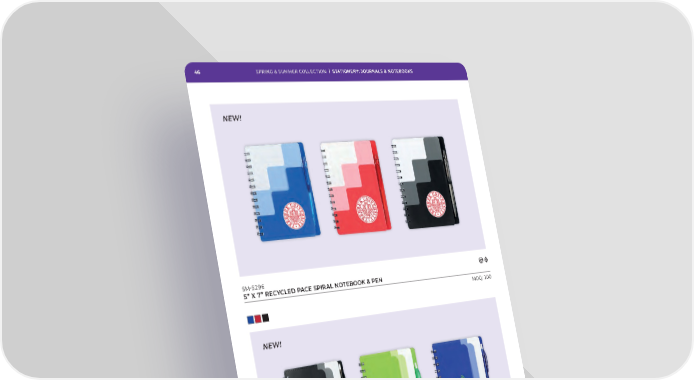 46 SPRING & SUMMER COLLECTION | STATIONERY: JOURNALS & NOTEBOOKS 46 NEW! SM ”‘£ œ” X ¥” RECYCLED PACE SPIRAL NOTEBOOK & PEN MOQ: NEW! SM ”‘£ œ” X ¥” RECYCLED DUAL POCKET SPIRAL NOTEBOOK & PEN MOQ:
