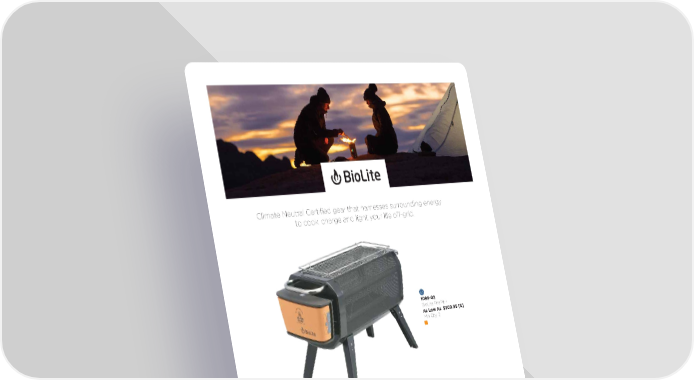 Climate Neutral Certified gear that harnesses surrounding energy to cook, charge and light your life off-grid. 1095-02 BioLite FirePit + As Low As: $309.99 [E] Min Qty: 2 1095-04 1095-01 1095-03 BioLite SolarPanel 5+ BioLite CampStove 2+ BioLite Alpenglow 250 As Low As: $109.99 [E] As Low As: $154.99 [E] As Low As: $64.99 [E] Min Qty: 5 Min Qty: 3 Min Qty: 5 19