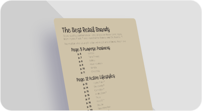 The Best Retail Brands Style, quality, performance – and of course those iconic logos, from Hydro Flask ® and Herschel to Stanley and Skullcandy ®. No matter who your gift is for, we’ve got a retail brand they’ll love. Page 5 Purpose Partners p. 6 tentree p. 7 Terra Thread p. 8 Bellroy p. 9 Klean Kanteen p. 10 Nimble p. 11 ChicoBag Page 12 Active Lifestyles p. 13 Hydro Flask ® p. 14 Skullcandy® p. 15 CamelBak® p. 16 Arctic Zone® p. 17 Thule p. 18 Root73TM p. 19 BioLite p. 20 Rite in the Rain p. 21 High Sierra ® Page 22 In Style And On Trend p. 23 Herschel p. 24 mophie® p. 25 Baronfig p. 26 Rocketbook p. 27 Silipint p. 27 Steel Chill-Cups TM p. 28 Wenger® p. 29 HidrateSpark p. 30 Bose® p. 31 JanSport®