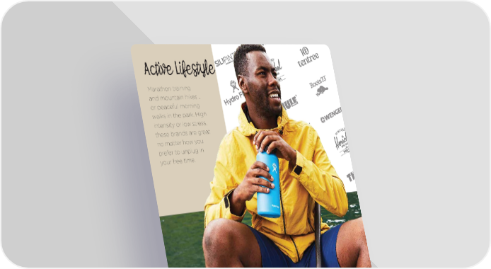 Active Lifestyle Marathon training and mountain hikes … or peaceful morning walks in the park. High intensity or low stress, these brands are great no matter how you prefer to unplug in your free time. 1212 | Purpose Partners